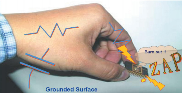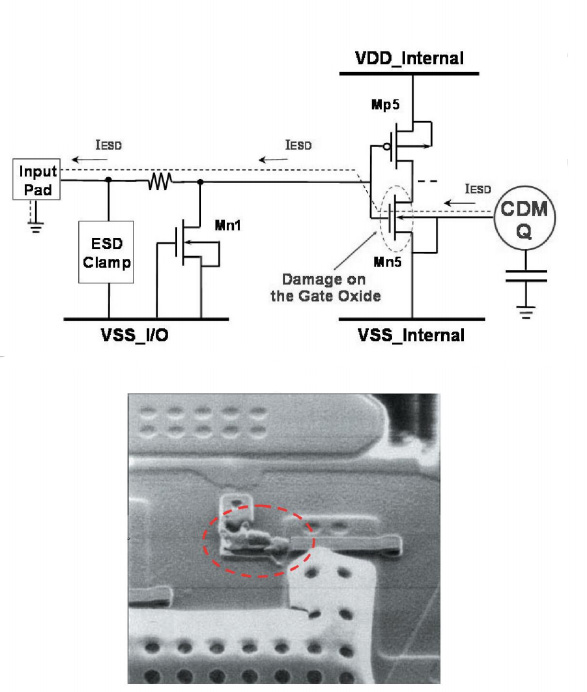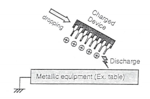 此放电模式是指IC先因磨擦或其它因素而在IC内部累积了静电,但在静电累积的过程中IC并未被损伤。此带有静电的IC在处理过程中,当其IC脚位碰触到接地面时,IC内部的静电便会经由此IC脚位流出来,而造成了放电的现象。 组件充电放电模式(CDM) ESD可能发生的原因及放电的情形显示于图(a)与图(b)