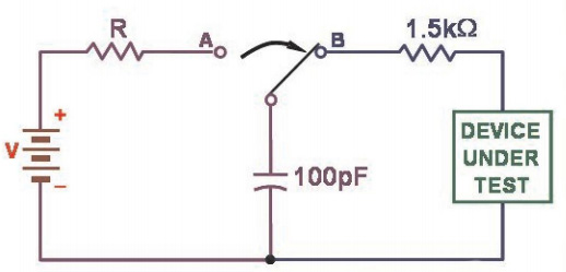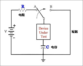 有关于HBM的ESD已有许多工业测试的标准规范,常用的测试标准规范包含:MIL-STD-883G method 3015.7,EIA/JEDEC JESD22-A114E,SDA STM5.1-2001,详细情形请参阅该工业标准。人体放电模式(HBM)可用下图的等效电路图来仿真,其中人体的等效电容定为100pF,人体的等效放电电阻定为1.5KΩ。
