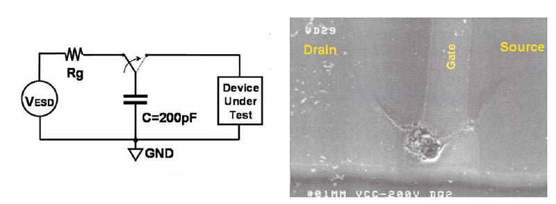 机器放电模式的ESD是指自动化生产或测试机器(例如机械手臂)本身累积了相当数量的静电荷,当此机器去碰触到IC时,该静电荷便经由IC的脚位放电。机器放电模式常用的测试标准规范为: EIA/JEDEC JESD22-A115A及ESDA STM5.2-1999,其等效电路图如下图所示。因为大多数机器都是用金属制造的,故其等效电阻为0Ω,其等效电容定为200pF。由于机器放电模式的等效电阻为0Ω,其放电的过程更短,在几毫微秒(ns)到几十毫微秒之内会有数安培的瞬间放电电流产生。