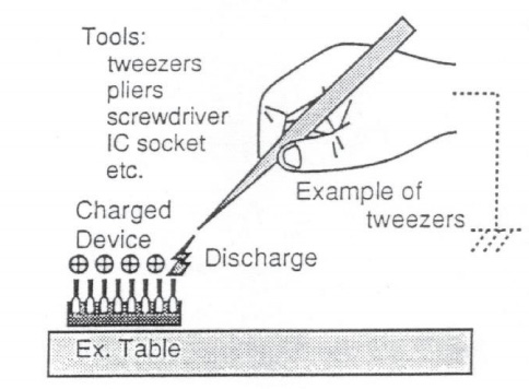 图(B)组件充电放电模式(Charged-Device Model) 静电放电的可能发生情形:IC自塑料导管中滑出时与导管磨擦后带电,IC脚朝上,经由测试者的金属镊子(接地的金属工具)而放电。