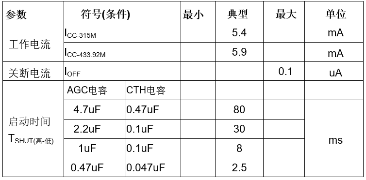 自动增益控制电路监测低通滤波器输出的包络信号幅度,通过调节低噪声放大器和中频运算放大器的增益,获得稳定的系统增益线性度和高性能的灵敏度。CAGC管脚为接收链路自动增益控制端口,外接滤波电容,滤波电容的取值会影响芯片启动时间,且成正比关系。举例:在交流转直流的工作环境下,建议选大一点的电容值;同理,稳定的直流供电场合下,可以选择略小一点的滤波电容。