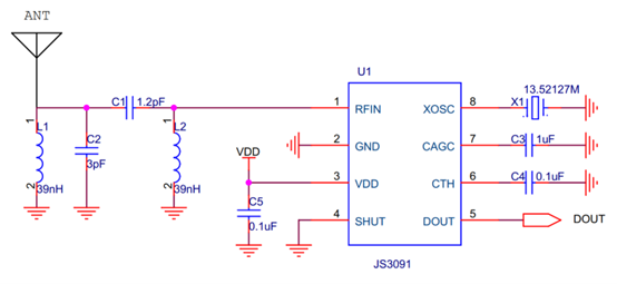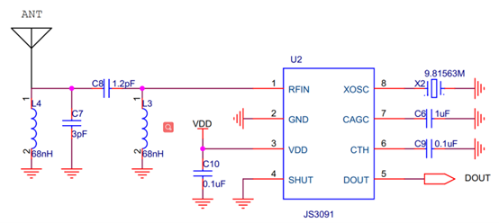 JS3091由以下几个电路组成:低噪声放大器,混频器,镜像抑制带通滤波器,中频放大器,峰值检测器,低通滤波器,自动增益控制,数据输出比较器,晶体振荡器电路,锁相环电路,电压参考和偏置电路,以及逻辑控制电路,是一款数模混合设计的一体化接收机。